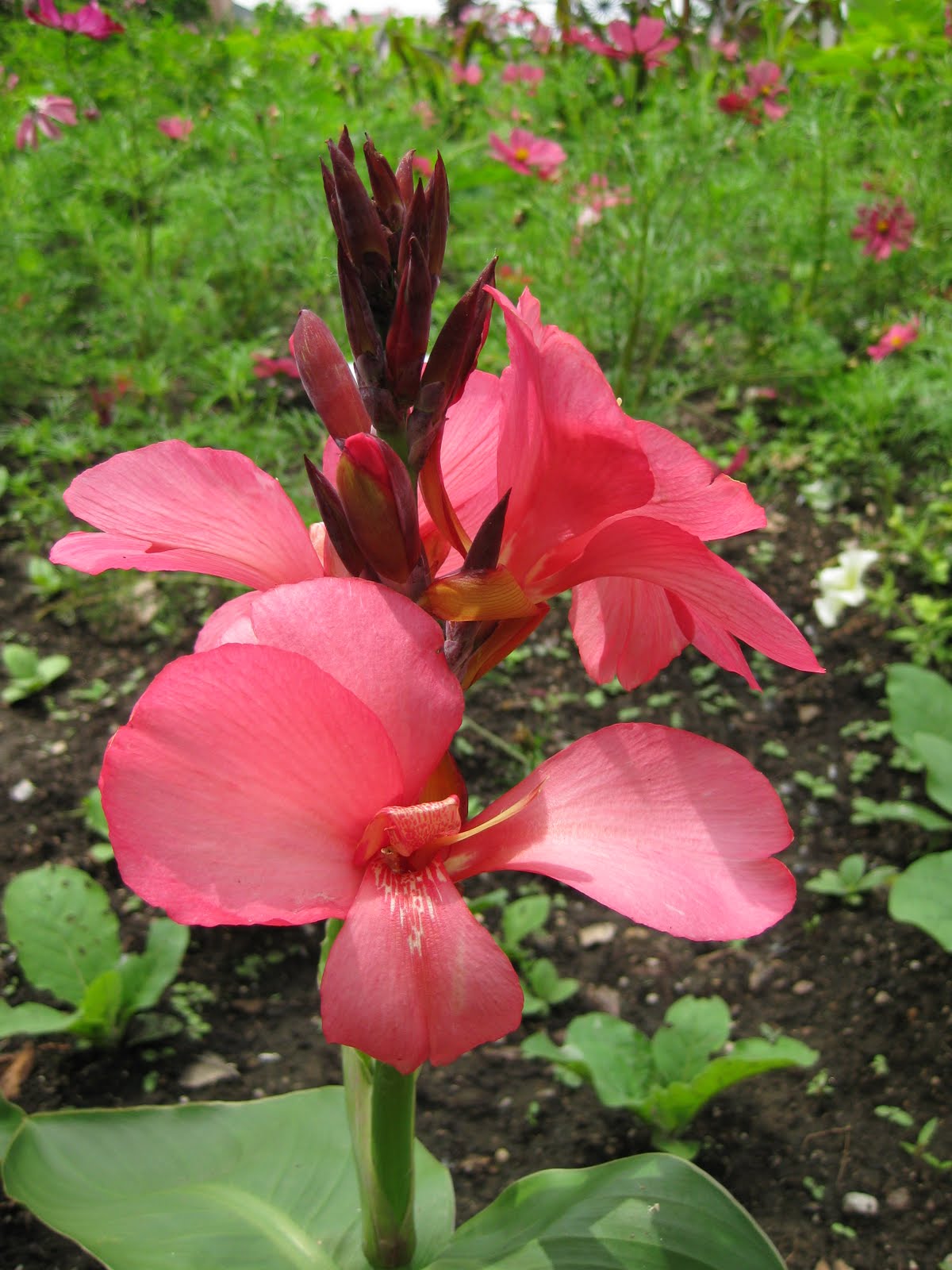 [Image] Today started with some rainfall and we thought we might have a wet day inside. The weather cleared quickly and we had an entire day with primarily overcast skies. It got extremely muggy and as I type this at 9:30 pm, it is raining outside and there has been thunder and tornado warnings. The image above was in the gazebo garden this morning and doesn't even show all the geese that came charging across the turf towards the pond. We seem to have three resident families of over 20+ geese total. They've been friendly enough but have been pecking away at some of our new annuals and are quite "messy". Nice shot below of the Noon Rotary Club members that came out to help plant this afternoon. We had Whitey, Hal, Maury, Gary, Ron and Heather. They did a nice job and the rains tonight should get everything soaked in nicely. [Image] It truly was a nice day of volunteerism and accomplishments aplenty. Marv and Terry sheared, roto[Image]tilled, planted and bounced between many projects. They continue to be a nice team. Marianne planted, weeded, watered, did her cutting display and got thru everything I put on her list. Janice was here this morning and worked on creating sign[Image]s, weeding and helping facilitate volunteers. Larry was all over the place with watering, repairs and other projects. Little Jerry worked on pruning various trees and shrubs. I kept placing more plants out in the gardens to address the remainder of our open spaces in need of annuals. Nice shot to the left of Quickfire hydrangea (Hydrangea paniculata) which is known for blooming very early and I've always been impressed with it. To the right is our plantings behind the visitors' center. The wax begonias go very well with the bloody dock (Rumex sanguineus ssp. sanguineus). Nice shot below of a new red cosmos (Cosmos bipinnatus 'Rubenza') that is a Fleuroselect winner and a big part of our red theme this year. [Image] We had another great Grumpy turnout. Big John, Del, Rollie and Pat all worked on mulching on while Ron W. and Urban planted annuals with Mary. Dick H. worked on some repairs and Dave, Bob A., Vern and Jim continued their carpentry work. They've made some very nice gates for the new arbor. Gary and Dr. Yahr did some planting too and we also saw Maury, Dave, Mike, Julie, Geesje and many others too. I kept my camera close at hand today and was repeatedly glad that I did. Below and to the left is the 'Tropical Rose' cann[Image]a which an All-America Selections winner and a canna that is easy to grow from seed (start it early though). This canna also stays around 36" and looks beautiful right now. Japanese beetles enjoy nibbling on cannas so hopefully they'll overlook these in our annual beds. To the r[Image]ight is the wooly sage (Salvia argentea) which is actually a zone 5 perennial. We grow it simply for the bold, white foliage that has everyone touching it. This specimen is in a cluster of containers in the middle of our English cottage garden and we've planted over 50 of these around the gardens primarily as an annual with significant foliage interest. Below is the golden spiderwort (Tradescantia x andersoniana 'Sweet Kate') with the nice combination of blue flowers and golden foliage.[Image]