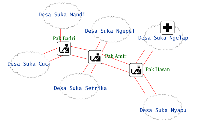 Karena mendapati bahwa pembelinya balita, bertanyalah si penjual: "Rumahmu di mana, Nak?" Sang anak menjawab: "Rumah saya ada di Desa Suka Nyapu." Penjualnya kemudian berkata: "Aku tak tahu di mana itu, Nak. Berangkatlah ke Pak Badri, kemudian tanyakan jalan menuju arah pulangmu." Sambil tersenyum, berangkatlah anak itu. Sesampainya di tempat Pak Badri, dia menanyakan jalan yang mana yang menuju ke arah desanya. Dia memberitahukan bahwa desanya adalah Desa Suka Nyapu. Di luar dugaan, Pak Badri menjawab: "Aduh Nak, aku tak tahu ke mana arah pulangmu. Aku cuma tahu jalan ke Desa Suka Mandi, Desa Suka Cuci, Desa Suka Ngepel, dan Desa Suka Setrika. Ke 2 desa yang terakhir melewati Pos Pak Amir. Selebihnya aku tak tahu." Menangislah sang anak, dan karena dia tak bisa pulang, maka dia menjalani sisa hidupnya sampai mati di Pos Pak Badri. Sayang sekali hidupnya harus berakhir seperti itu. Kejadian itu tidak perlu terjadi andaikata sebelumnya Pak Amir berkata: "Nak, sepulangmu nanti katakan kepada Pak Badri bahwa kau berasal dari Pos Pak Amir," karena Pak Badri memang tahu ke mana jalan yang harus ditempuh kalau anak itu akan kembali menuju Pos Pak Amir, tapi selebihnya tidak. Setelah sampai di tempat Pak Amir, anak itu bisa diteruskan menuju tujuan yang sesungguhnya, yaitu rumahnya di Desa Suka Nyapu.Computer Network Version of Previous StoryDalam dunia jaringan, padanannya kira-kira begini: