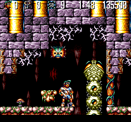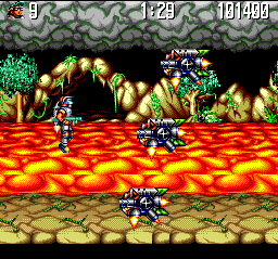 The adventure is a bit too short at five stages, but each level can take a while (not an irritatingly long while, mind you), and variety is definitely present, as three of the stages are run-and-gun fare while the other two play like side-view shoot 'em ups. The former aren't nearly as intense as a typical Contra board, but they do make you deal with plenty of tricky platforming sections, and you've always gotta be on your guard, as swift, bizarre creatures roam the grounds. [Image][Image]