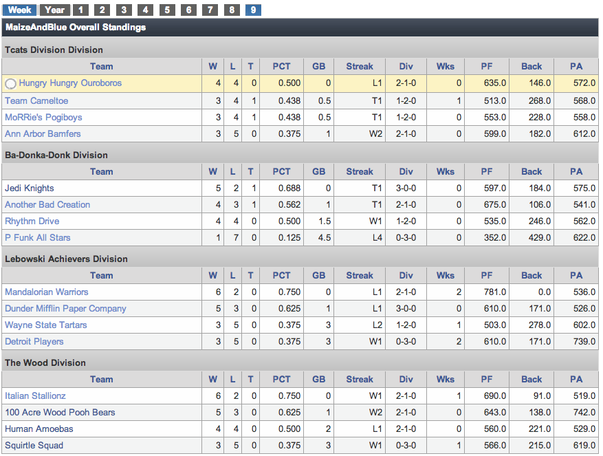 It's high time Heath Miller steps in for Antonio Gates, as the Charger has had only one good game this season. Also, the Ouroboros haven't scored over 100+ in any week -- although they are steady and are the fifth highest PF team -- nor faced an opponent who has either. That's the definition of middle of the road right? Can the Ouroboros fend off their divisional challengers despite going seven weeks not knowing they had three unfilled roster slots? New owner Jon also committed tried to sneak in two kickers last week, resulting in an illegal roster. Nice!